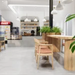 Phong cách hiện đại của BLU Cafe & Milk Tea được thể hiện qua việc sử dụng các chất liệu cao cấp như kính, thép, và gỗ công nghiệp. Những vật liệu này không chỉ mang đến vẻ ngoài sang trọng mà còn đảm bảo độ bền bỉ và dễ dàng bảo trì. Nắng Decor đã chọn gam màu tươi sáng cho quán, từ màu sơn tường đến màu sắc của các chi tiết nội thất, tạo ra một không gian mở và tươi mới. Đây là yếu tố thu hút khách hàng, đặc biệt là các bạn trẻ và sinh viên.